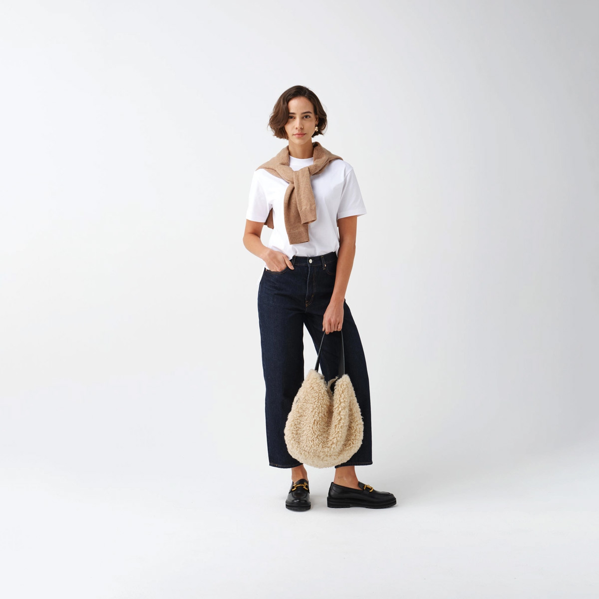 The cream faux fur feels irresistibly soft to the touch, inviting you to carry it everywhere — from city strolls to cosy café moments. It’s the kind of bag that makes even a simple outfit feel special, adding gentle movement and warmth to your look. The gathered detailing gives it beautiful structure without losing that relaxed, fluid feel, while the shoulder strap sits comfortably and elegantly on your arm. The joyful and playful aspect of this handbag comes from the exterior look of the faux sheepskin with little curls.