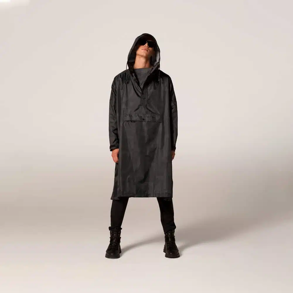 Treten Sie selbstbewusst und stilvoll in den Sturm, eingehüllt in den ausgefallenen Charme unseres Regenponcho Back to Black Art Camo Regenponchos. Dieser Poncho ist nicht einfach nur ein Regenschutz – er ist deine modische Rüstung gegen die Elemente.
