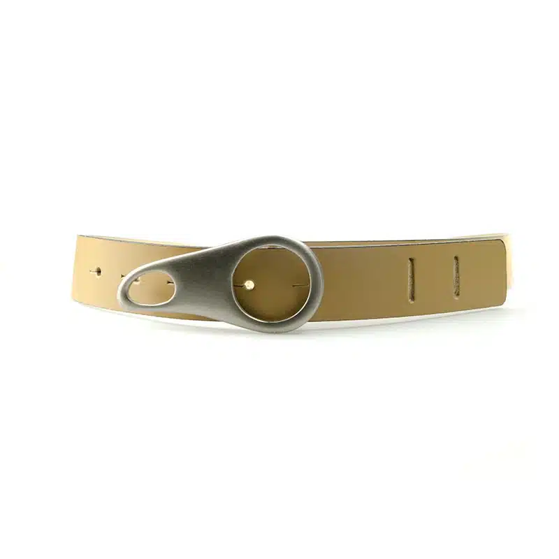 Die Farbe des Ledergürtels mit besonderer Schnalle ist ein sanftes Beige, eine sehr schicke Farbe.