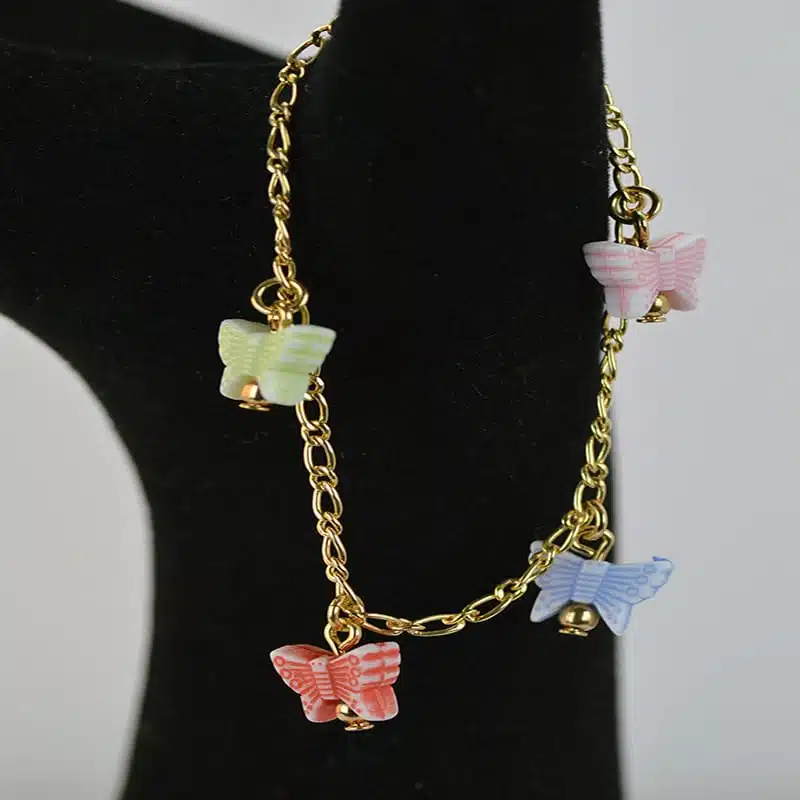 Das Bettelarmband besteht aus vier farbigen Schmetterlingen – Sie müssen also keine zusätzlichen Anhänger kaufen. Die Schmetterlinge haben die Farben Pink, Blau, Rot und Grün des Butterfly Charm Armbands.