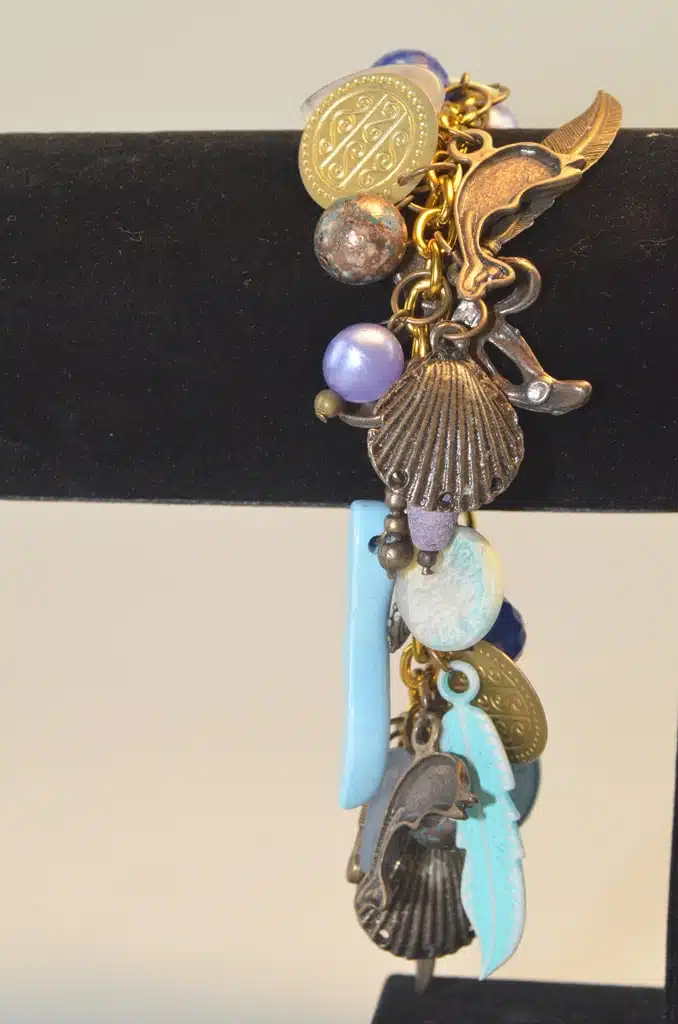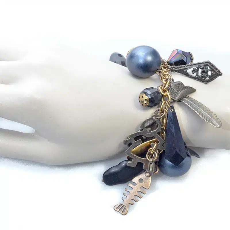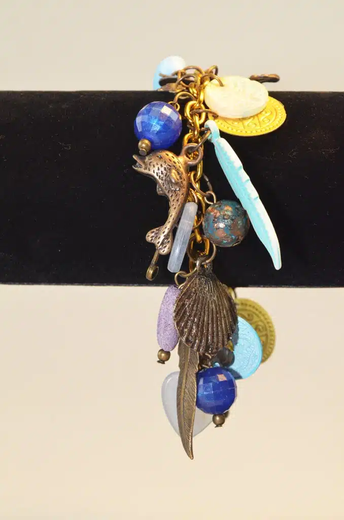 Blaues Bettelarmband mit einer enormen Menge an Anhängern. Also keine Notwendigkeit, zusätzliche Anhänger zu kaufen. Einige der Anhänger auf dem Armband sind Federn, Muscheln, Münzen, Figuren, Perlen und eine Fischgräte und viele mehr natürlich.