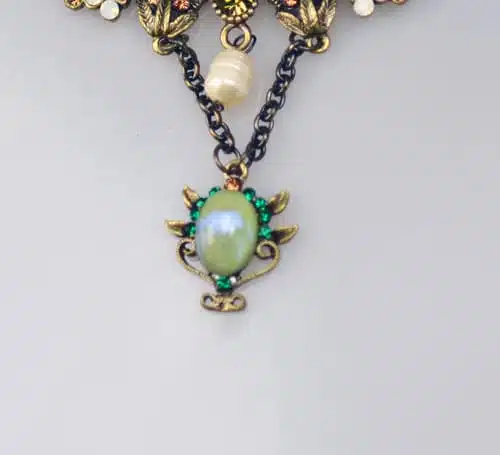 Die kleinen perlenfarbenen Perlen mit dem altgoldfarbenen Metall sind eine schöne Kombination. Dazu kommt noch diese schöne große, sehr farbige Perle. Diese Brosche wird an einem Kleid oder einer Jacke umwerfend aussehen. Dies wird Ihr Outfit komplett machen.