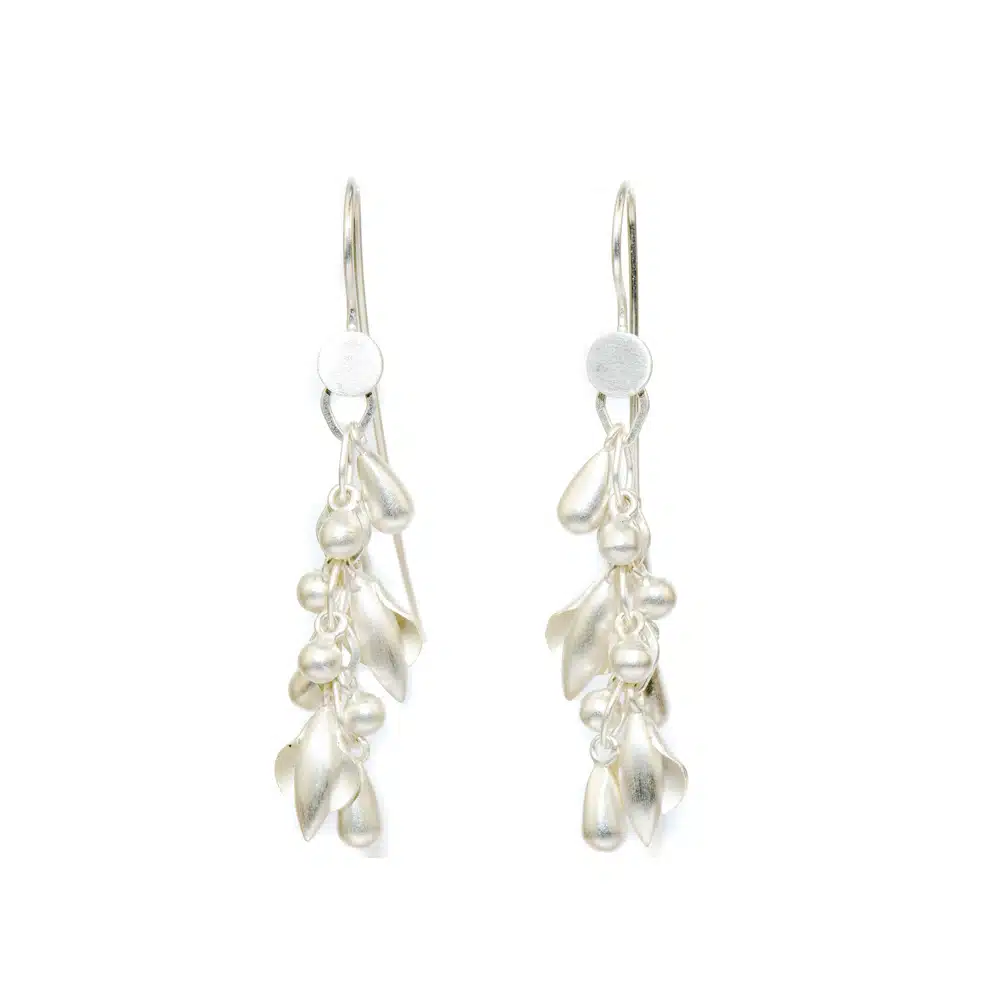 Schöne lebendige Silber Ohrhänger mit viel Schwung Sie sind lang und baumeln mit verschiedenen Ornamenten, die von der Wisteria Pflanze inspiriert sind. Sie können diese Ohrringe mit einem Armband und einer Halskette kombinieren, um ein perfektes Paar zu erhalten.