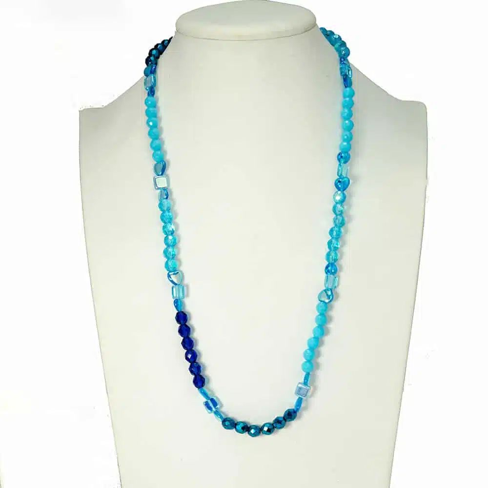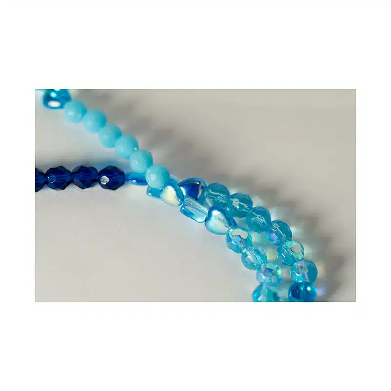 Dieses Schmuckset zeichnet sich durch Subtilität aus. Die herzförmigen Perlen und die verschiedenen Blautöne machen diese auf den ersten Blick schlichte Halskette zu etwas ganz Besonderem.