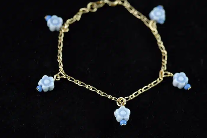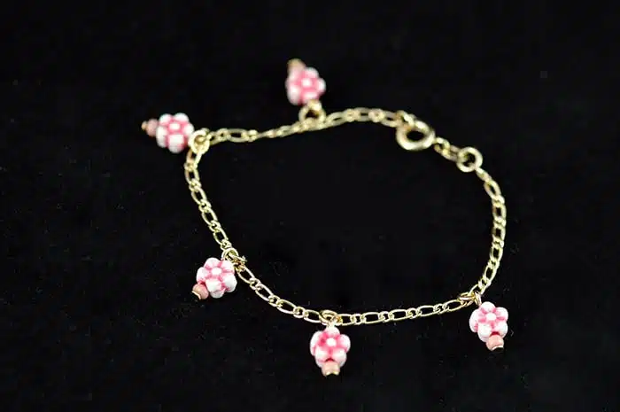 Joli bracelet de fleurs enfants. Ils existent dans les couleurs suivantes : fleurs bleues ou roses. La chaîne est plaquée or 18 carats. Le placage est de haute qualité, il ne s’altérera donc pas. Ce bracelet de fleurs pour enfants ou nos autres bijoux pour enfants constituent, bien entendu, un joli et luxueux cadeau pour votre enfant, nièce à petit prix.