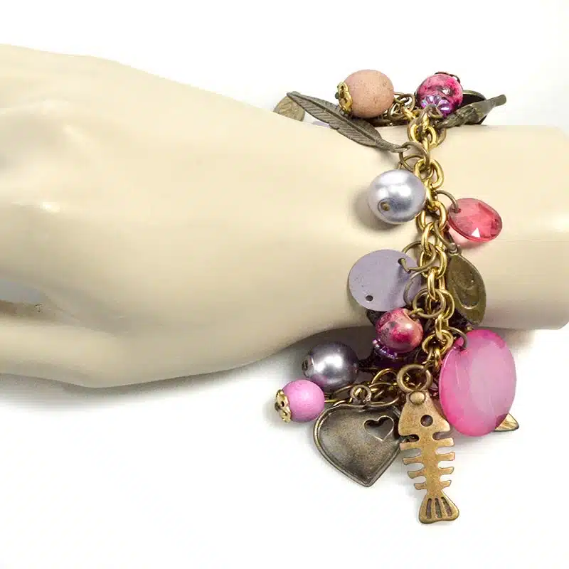 Un bracelet à breloques rose avec de nombreuses breloques. Parmi les breloques incluses dans ce bracelet figurent des plumes, des perles, des coquillages et bien d’autres encore.