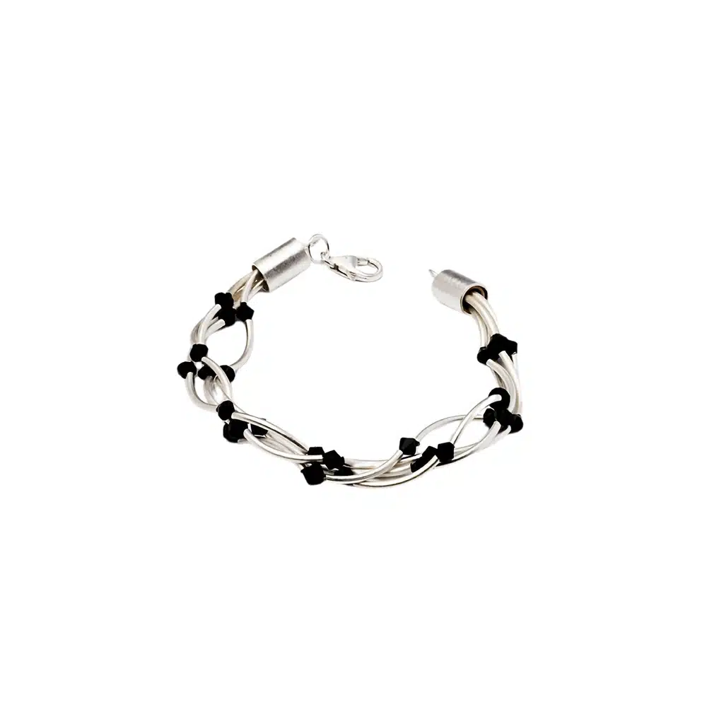 Le bracelet comporte trois fils d’argent qui s’enroulent le long du bracelet. A plusieurs endroits, on trouve des perles d’onyx. Le contraste entre l’argent mat et les perles d’onyx donne un aspect très particulier. Ce bracelet peut également être commandé avec des perles en corail ou Swarovski. Renseignez-vous sur les possibilités.