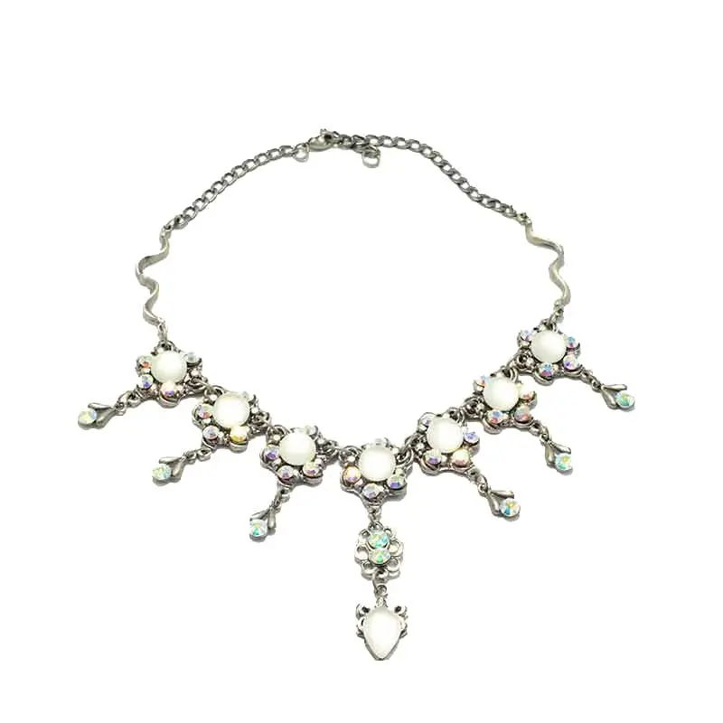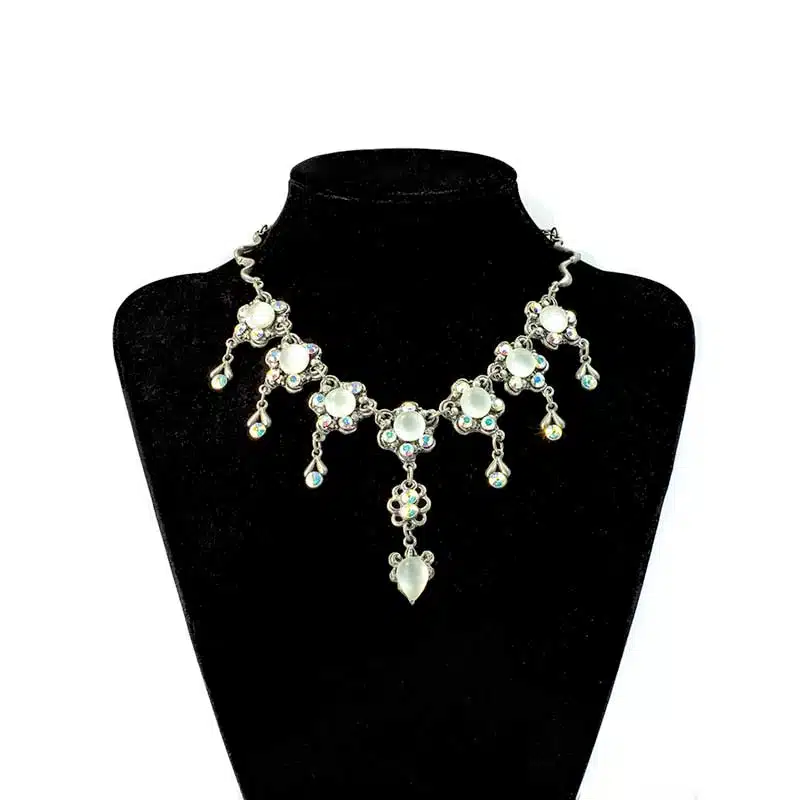 Plusieurs cristaux entourent superbement toutes les gouttes. Ces cristaux sont fabriqués à partir du célèbre cristal Aurora Borealis de Swarovski. Cela rend le collier encore plus unique grâce à ses nombreuses couleurs.