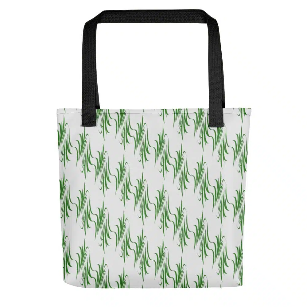 Ce Tote Bag Vert est fabriqué en tissu 100% polyester filé et présente un joli motif vert avec des poignées noires. Le sac mesure 38 cm x 38 cm et peut contenir 10 litres avec une limite de poids maximale de 20 kg. Il comporte également des poignées en coton 100% naturel.