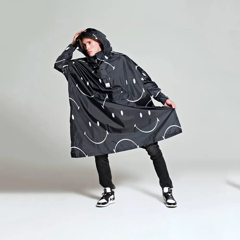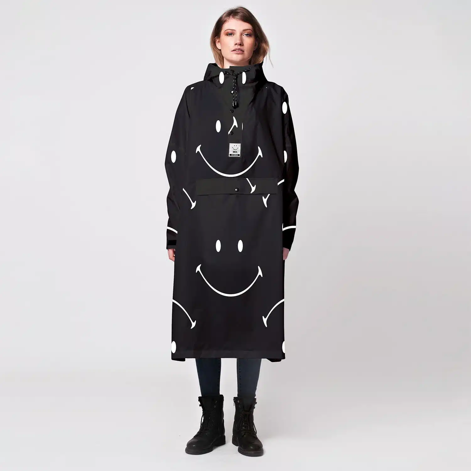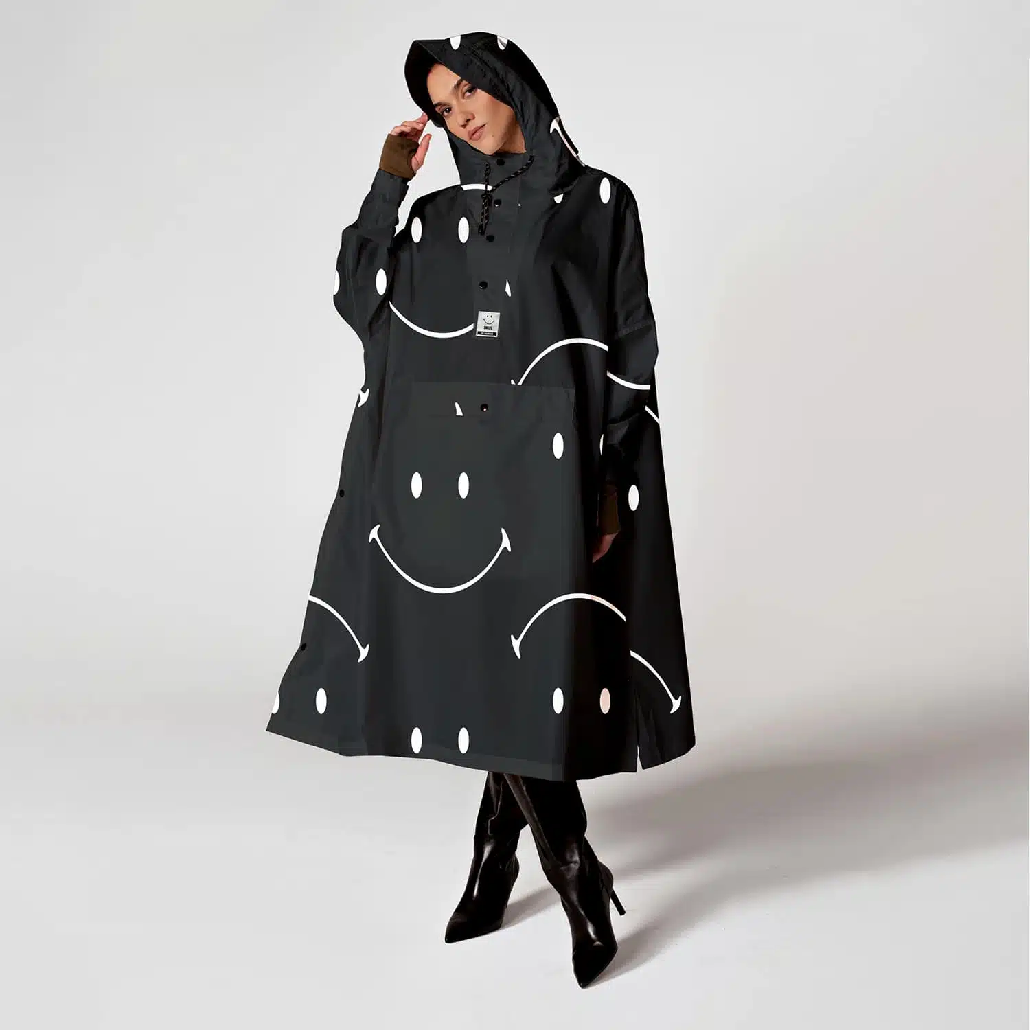Nous allons mettre un sourire sur votre visage 🙂 et porter des smileys aussi. Ce poncho de pluie Noir avec manches est un poncho pratique et magnifique en noir et blanc. Orné de smileys en blancs, ce poncho est l’incarnation de l’amusement et du chic.