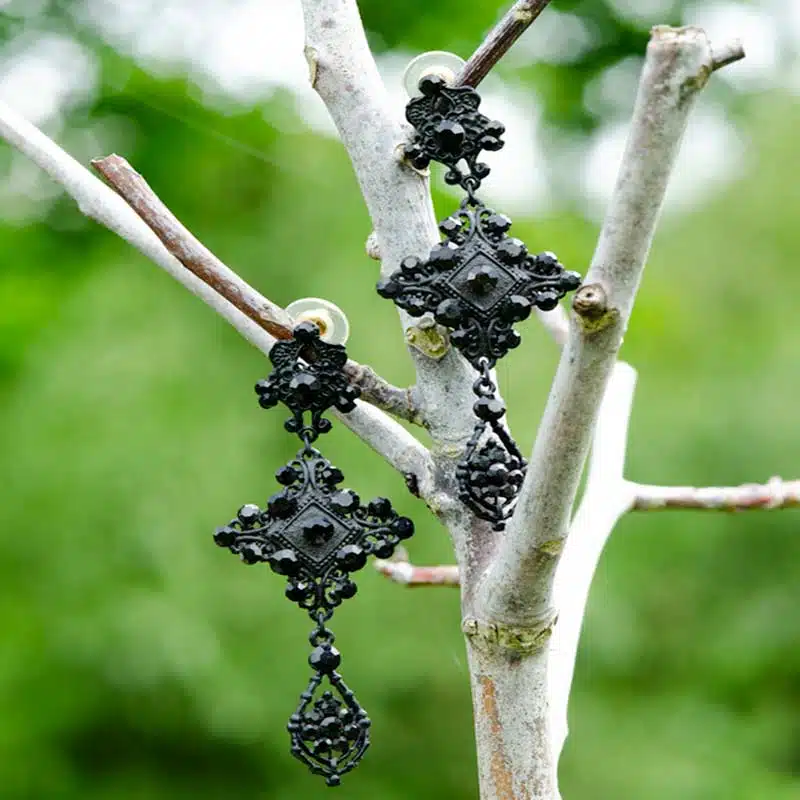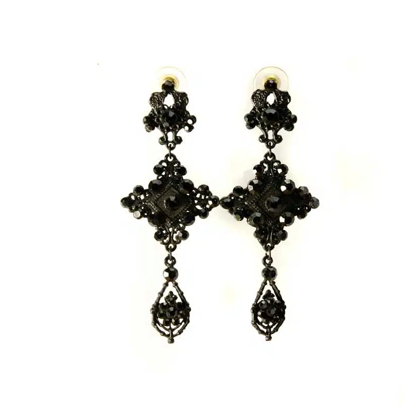 What you see right now is a gorgeous looking long black statement earrings with Swarovski crystals. The earrings are set with several different sizes of crystals. They are intricate-looking earrings which can be worn formally or in a gothic style. You can also combine them with our goth necklace. That makes a magnificent necklace set and definitely a head-turner.