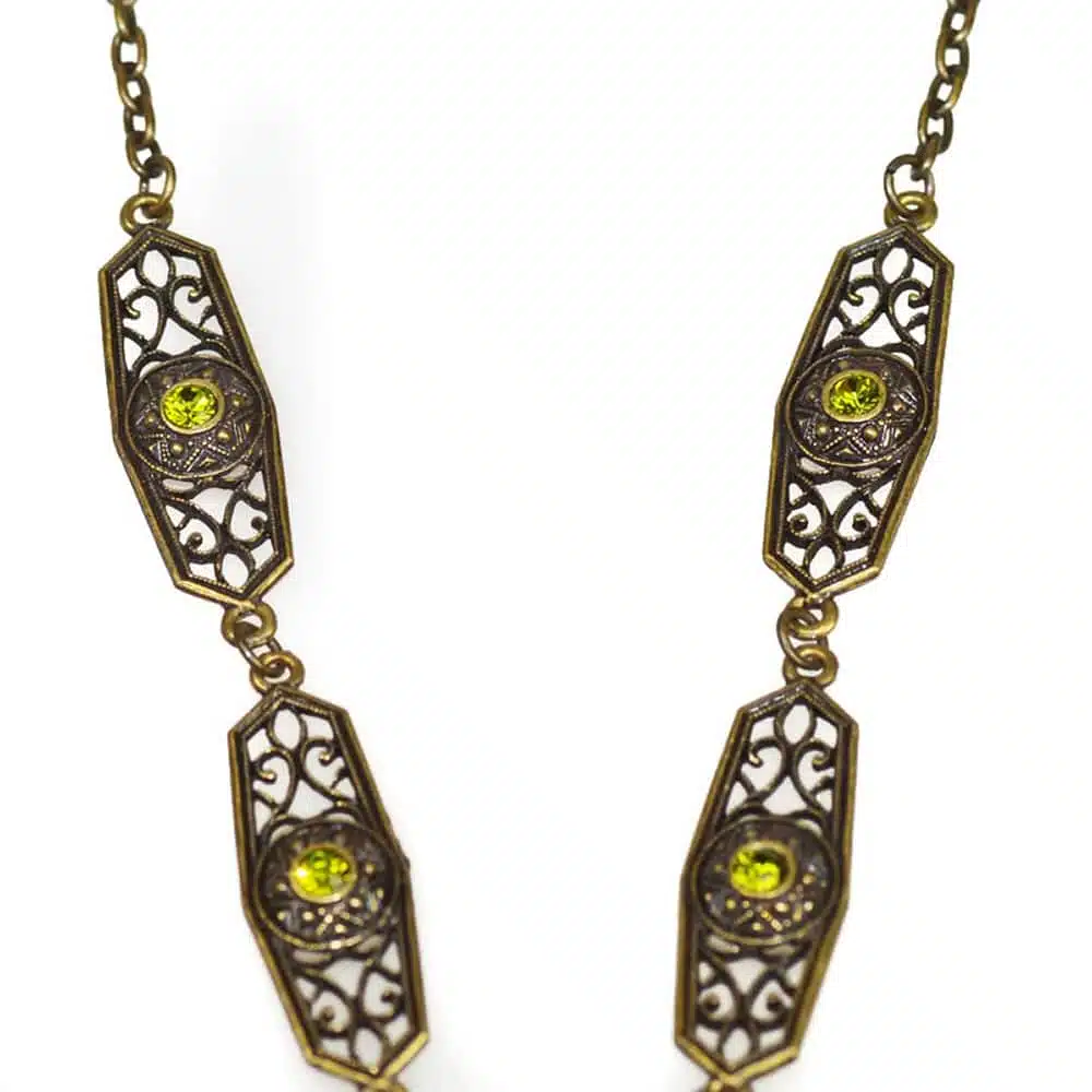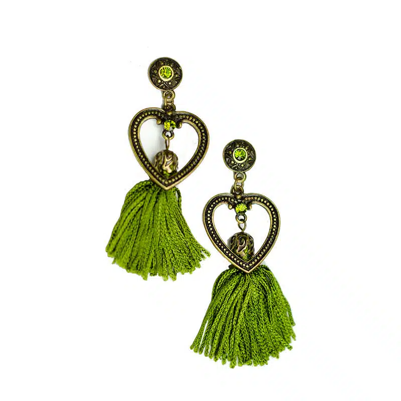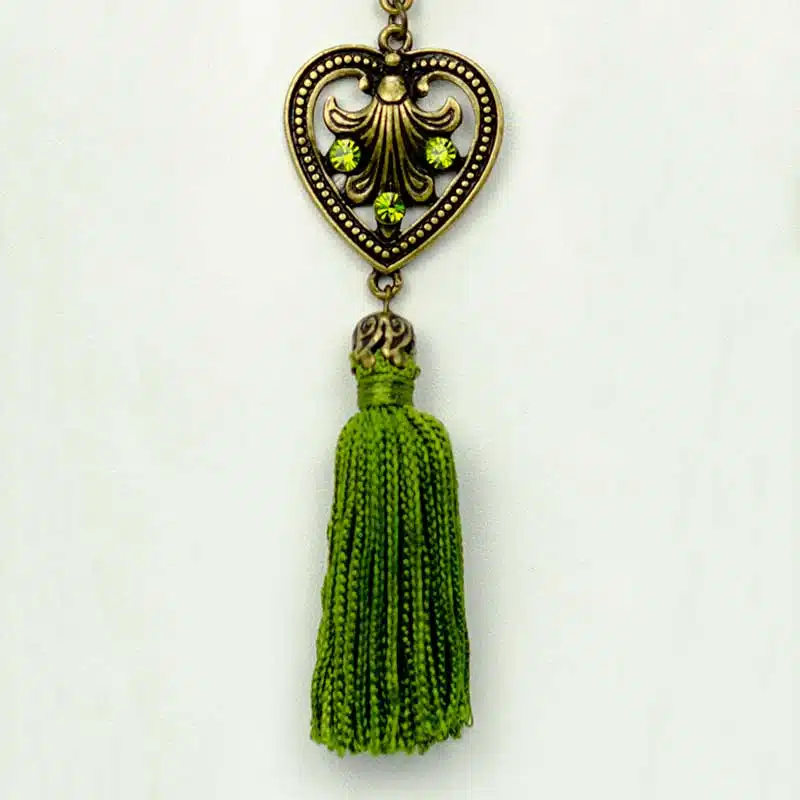 We have in our shop this lovely green tassel necklace set that has the look of the roaring twenties. It has long matching earrings with green tassels and a heart shape. (really different) The metal of this set has an old gold/brass look.