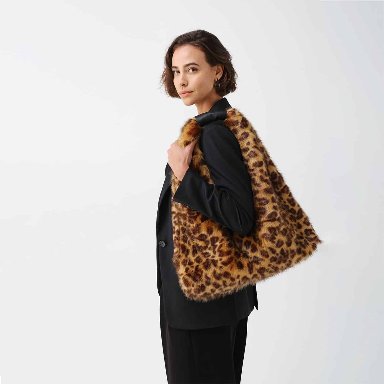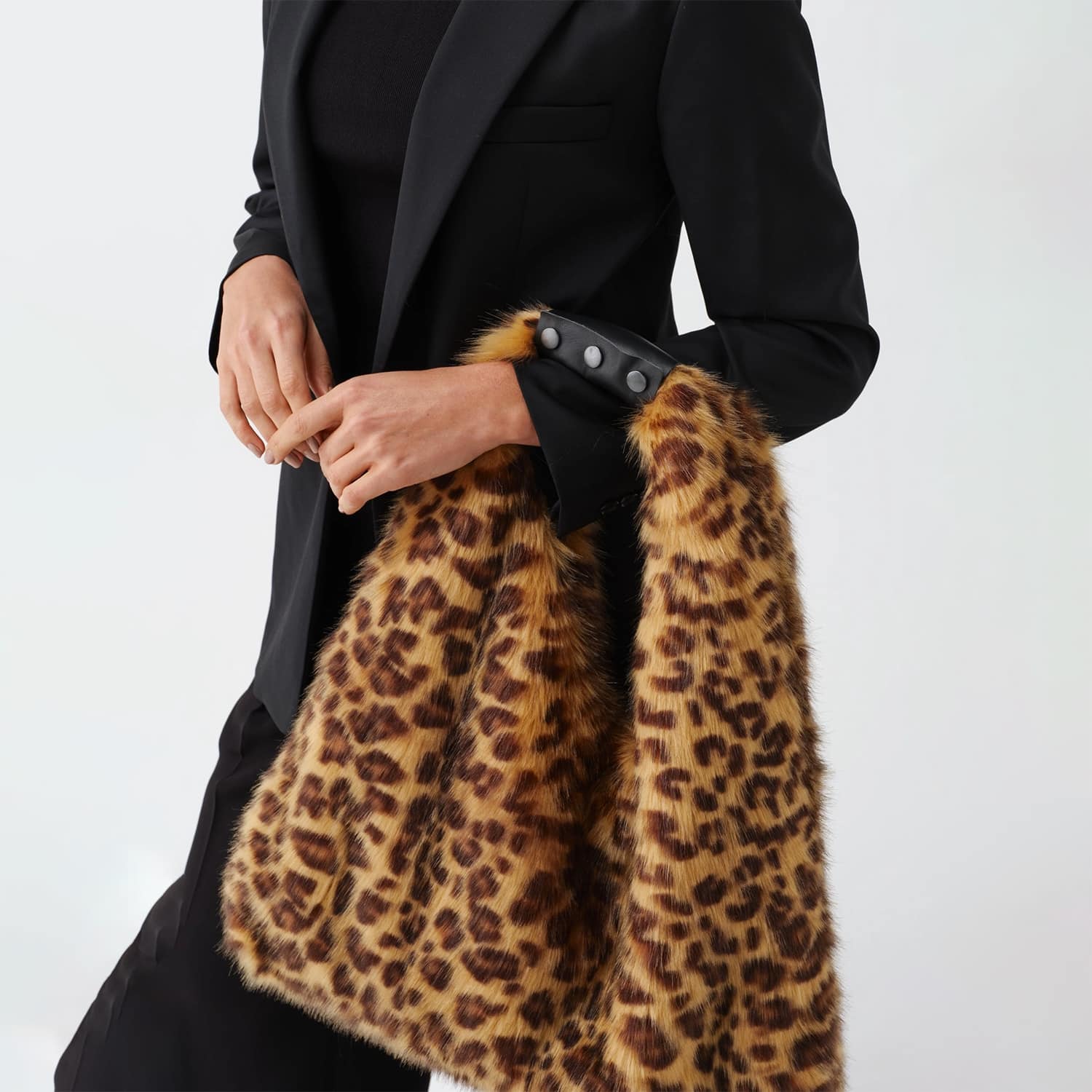 - Materiaal: Luxe imitatiebont met leren handvat en metalen studs