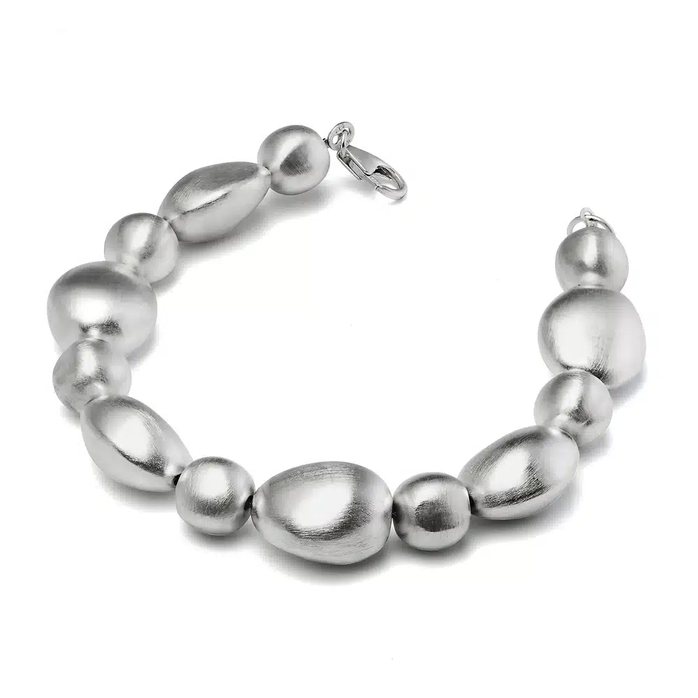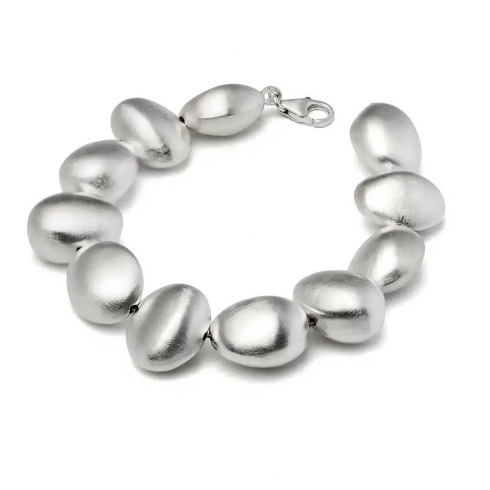 We bieden twee versies van de handgemaaktezilveren armband kiezel aan. Namelijk een versie met gelijkmatige zilveren kiezels en één met ongelijkmatige zilveren steentjes. Elke handgemaakte armband is prachtig, dus de keuze is aan jou!