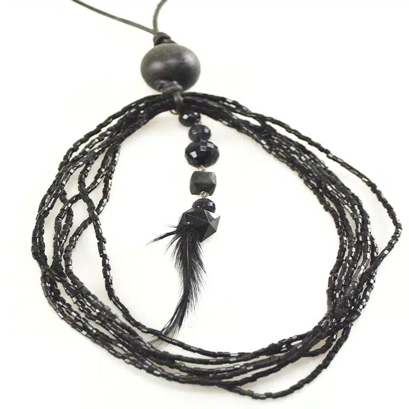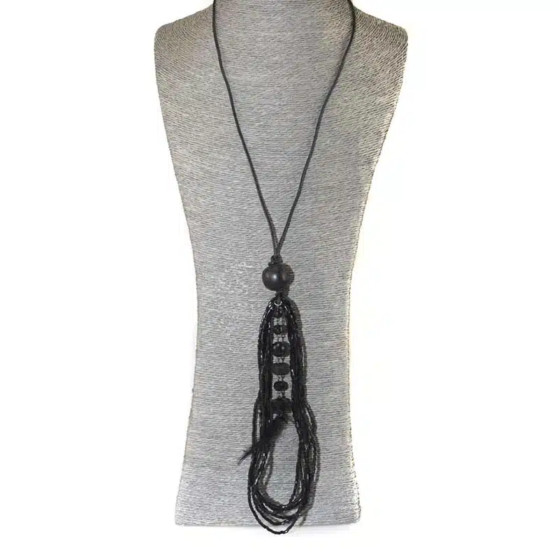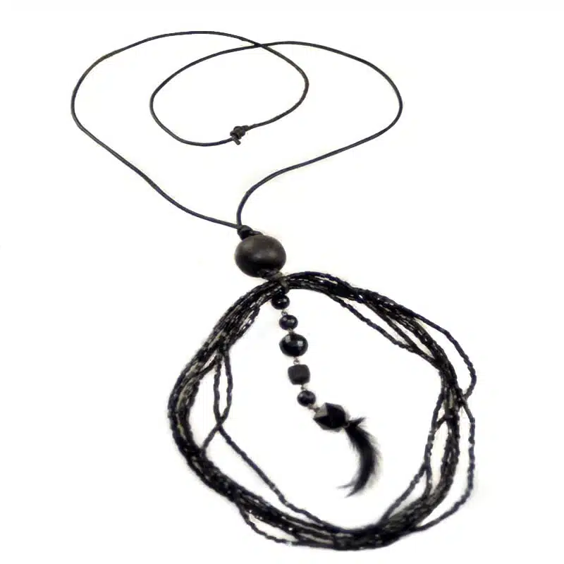 Boho Veren Ketting geheel zwarte kleur. De leren halsketting kan verzet worden. Dus of je de halsketting nu heel lang of korter wilt dragen, het kan. De maximum lengte is ongeveer 53 cm.  Er is een grote houten kraal in het midden waaraan kleinere kralen volgen. Hele leuke halsketting. Deze kan gecombineerd worden met heel veel kledingstukken. Kan worden met heel veel kledingstukken. Zelfs met klassieke kleding. Goede aanwinst voor je garderobe. Ook voor niet boho kleding staat hij geweldig.