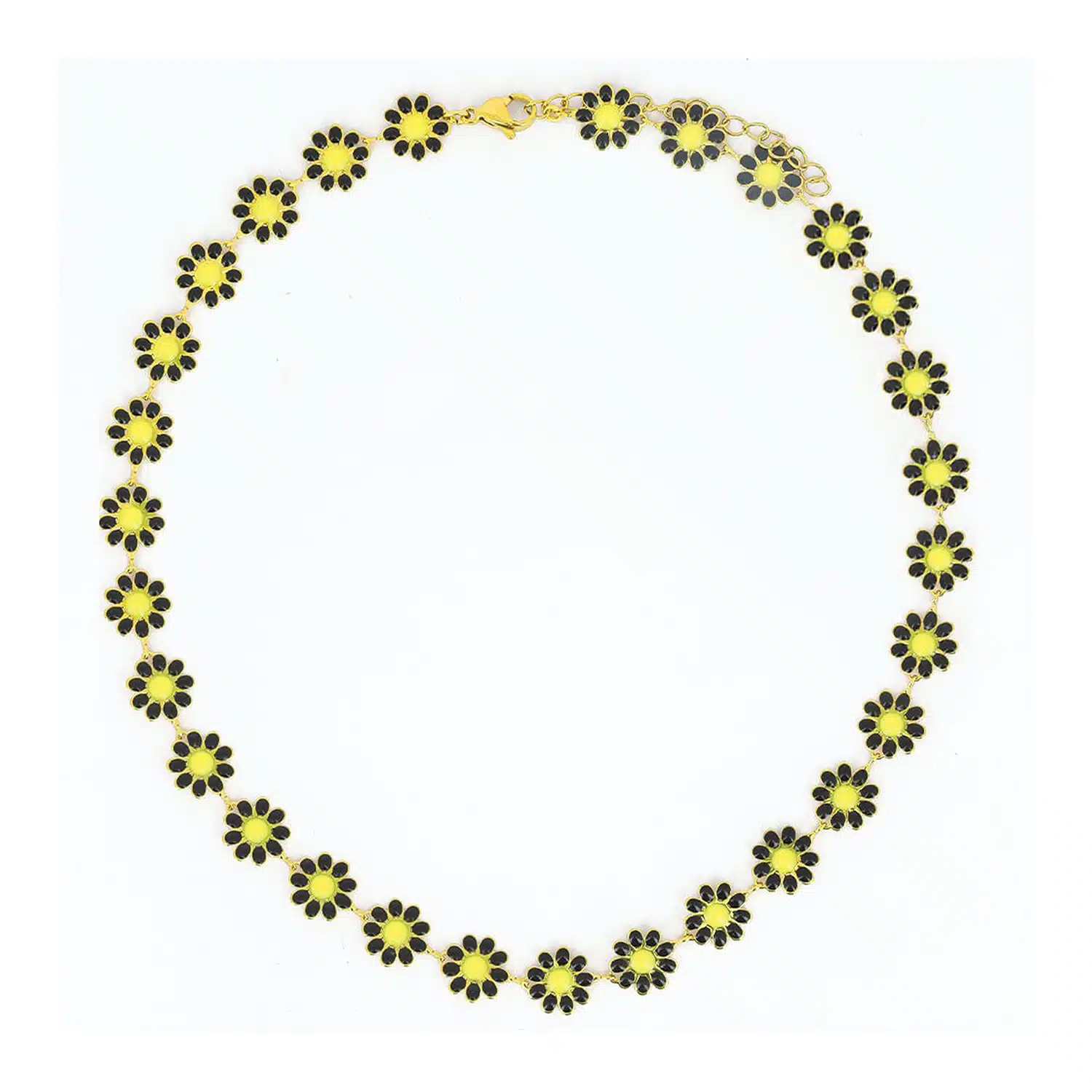 Het middelpunt, of beter gezegd de middelpunten van deze mooie choker zijn de reeks prachtige zwarte en gele bloemen, die delicaat gerangschikt zijn en perfect worden aangevuld met een vergulde stainless steel ketting. Het contrast tussen de levendige gele zwarte bloemetjes en de warme gouden gloed van de ketting creëert een boeiende visuele harmonie die zeker zal opvallen, waar je maar ook heen gaat.