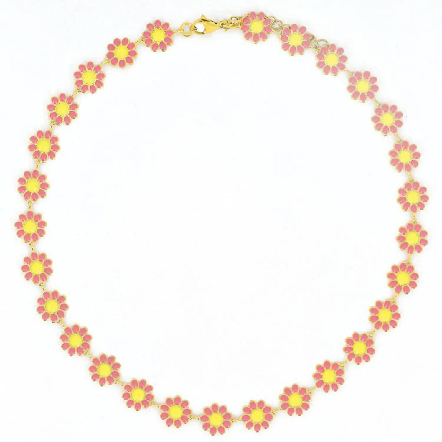 Deze roze choker ketting is bijna hetzelfde als de gele en zwarte choker ketting. Het enige verschil zijn de kleuren en de grote van de bloemetjes. Bij de roze choker ketting zijn de bloemetjes iets kleiner.De keuze is aan jou.