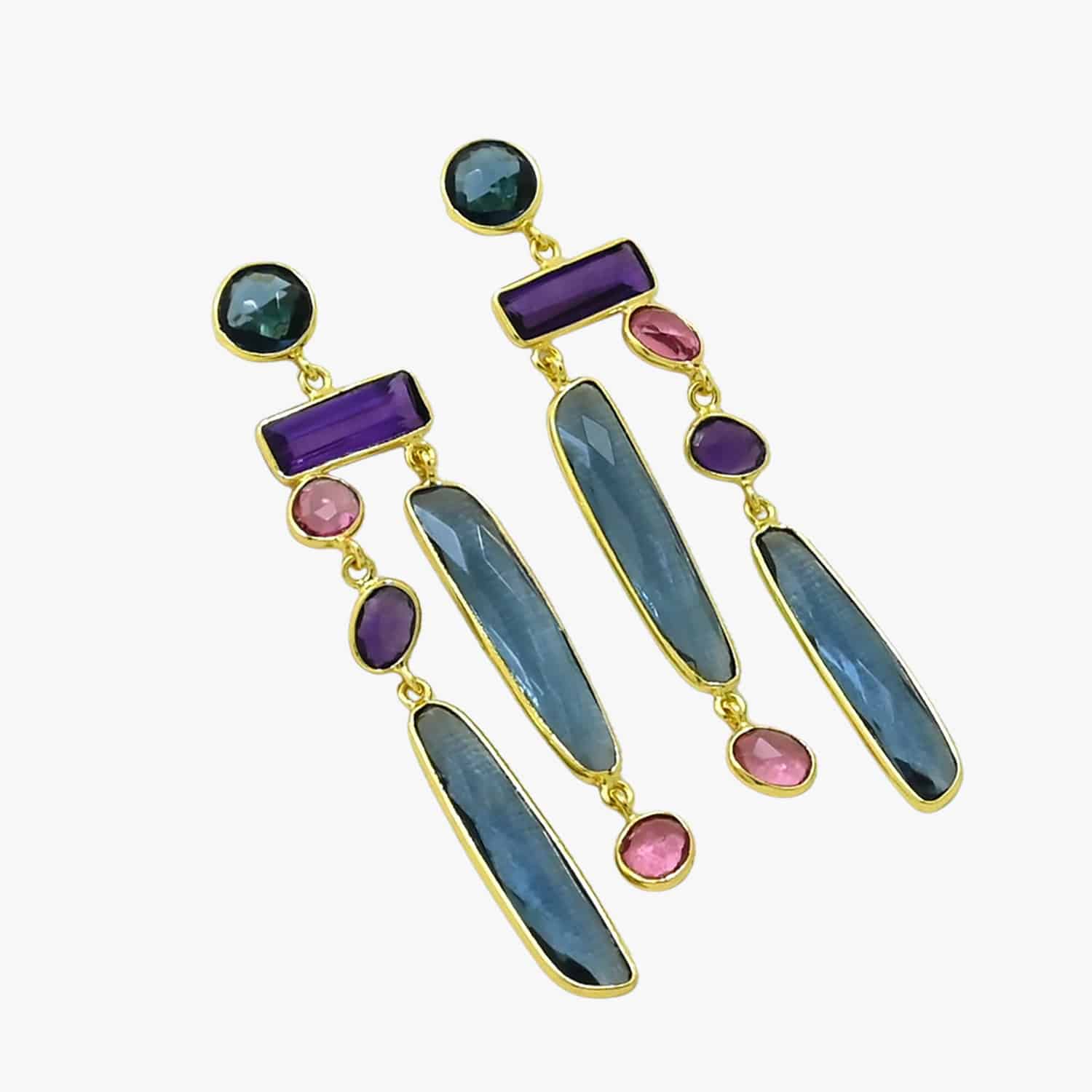 Gedurfd en toch verfijnd – deze Blauwe Ioliet Oorbellen zijn gemaakt om te betoveren. De opvallende mix van blauwe Ioliet, paarse Amethist en roze Toermalijn zorgt voor een levendige harmonie van kleuren, waarbij elke steen het licht op zijn eigen betoverende manier weerkaatst. Deze oorbellen zijn gemaakt van 18k goudgevuld gerecycled messing en combineren een modern ontwerp met zorgzaam vakmanschap.