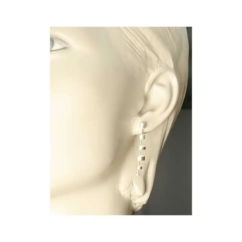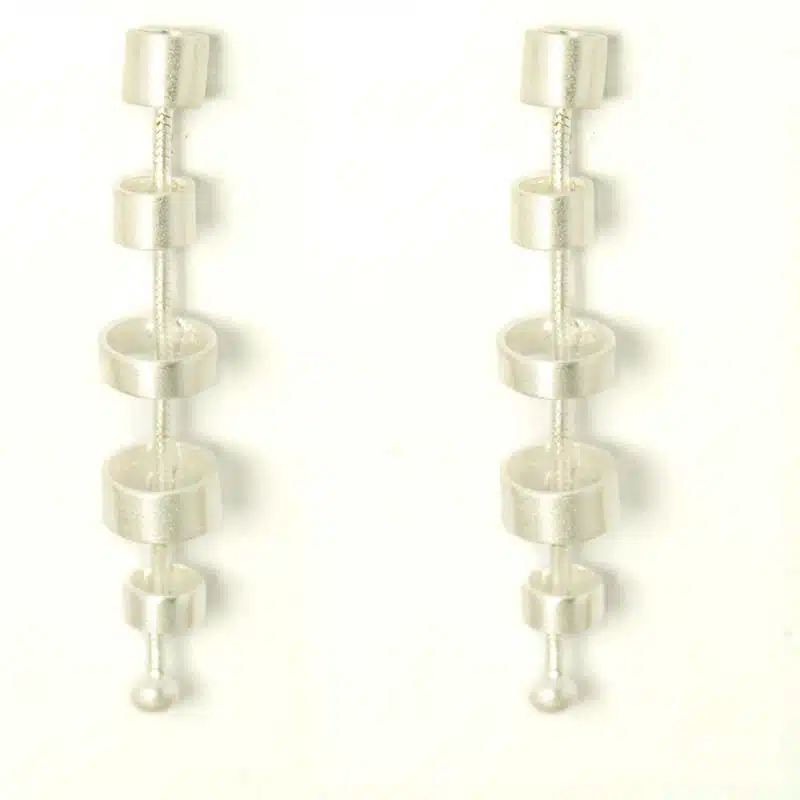 Breng elke dag van de week wat fun in je look met deze coole tube zilveren oorbellen. Aan de ketting zijn vijf rondjes van verschillende afmetingen bevestigd. Door de flexibiliteit over de gehele oorbel is het niet een stijf geheel maar een mooi bewegend geheel. Je kunt zien dat de oorbellen met veel vakmanschap zijn gemaakt. Het gebruikte materiaal is wederom sterling mat zilver, en door de afwerking lijkt het op zilver zijde.