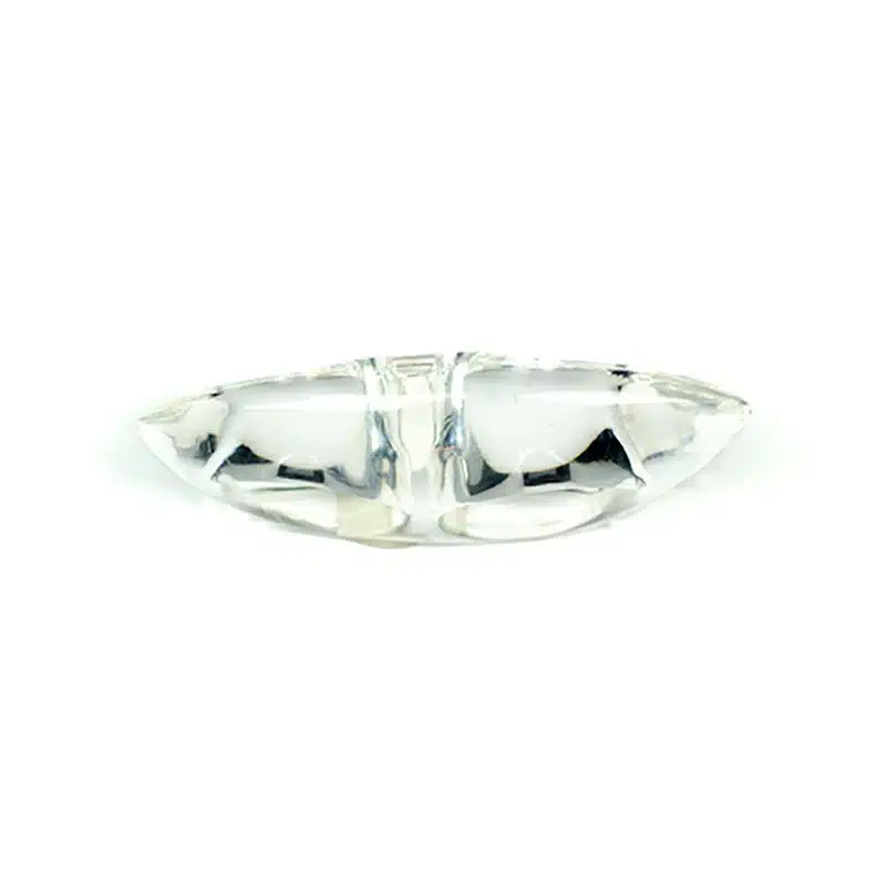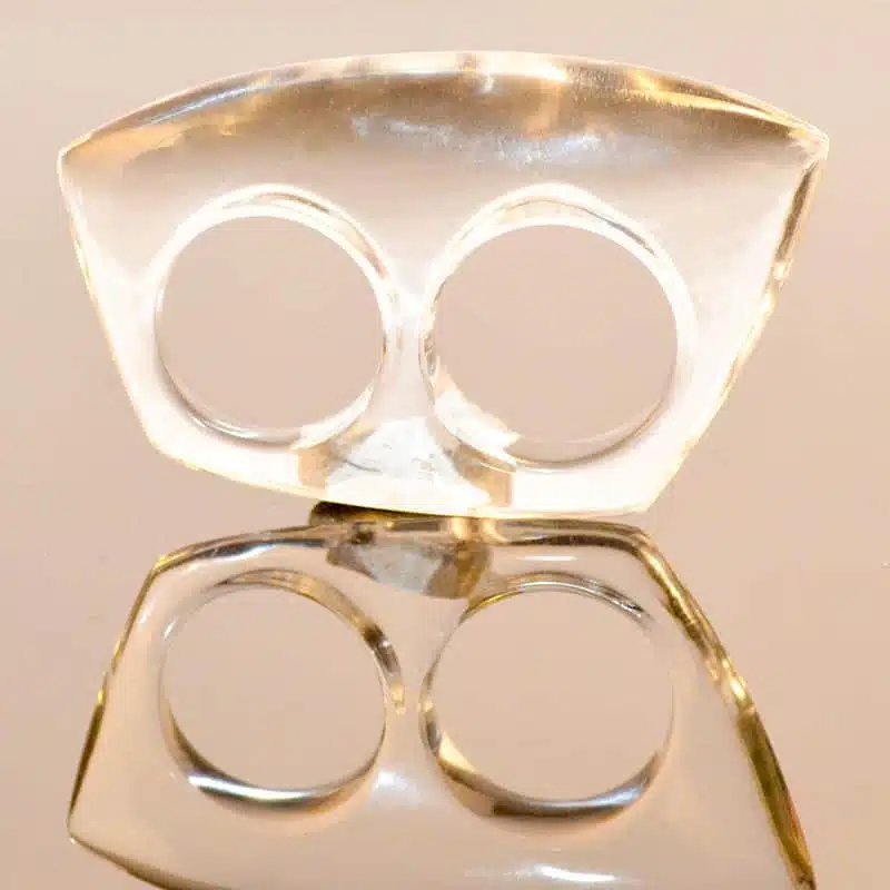 De voorkant heeft zachte rondingen maar de uiteinden zijn een beetje puntig.. De acryl dubbele ring is in totaal ongeveer 4 cm lang en totaal doorzichtig. Als je van speciale ringen houdt dan is dit de ring voor jou.