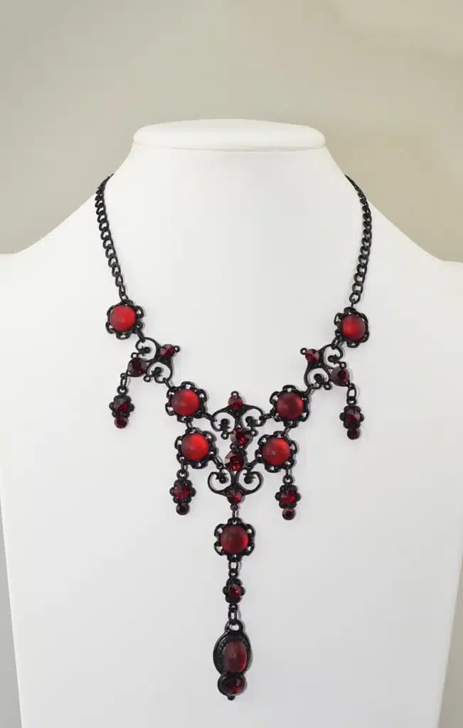 Baton rouge rode gothic sieraden set. Dit is een van de mooiste en bijzondere stukken die wij in onze collectie hebben. De rode Siam Swarovski kristallen contrasteren erg mooi tegen het zwart en elegante gevormde halsketting. Door deze contrast is deze sieradenset met perfect bijpassende oorbellen een gedurfde combinatie.