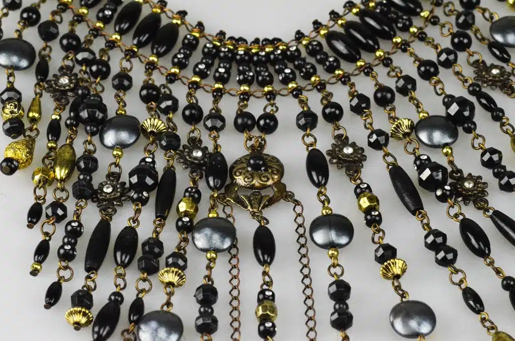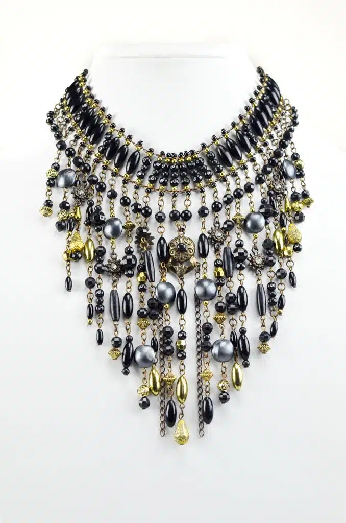 Boho tribal halsketting Niagra met bijpassende oorbellen. De halsketting is vol met bedels, kralen en ornamenten. Bijpassende oorbellen bestaan uit dezelfde kralen en bedeltjes. De hoofdkleuren zijn goud en zwart. Dit komt natuurlijk weer terug in de oorbellen. Deze zijn ongeveer 5 cm lang en elegant. De halsketting valt als een waterval naar beneden met de vele strengen. Vandaar ook de naam van de wereldberoemde waterval.
