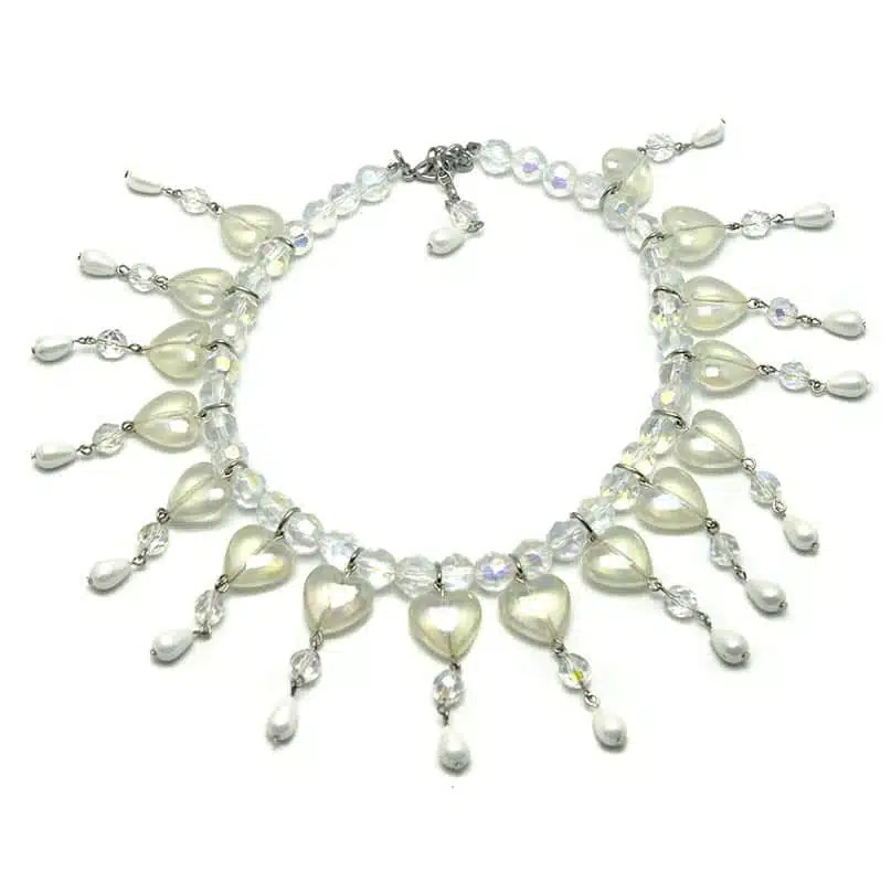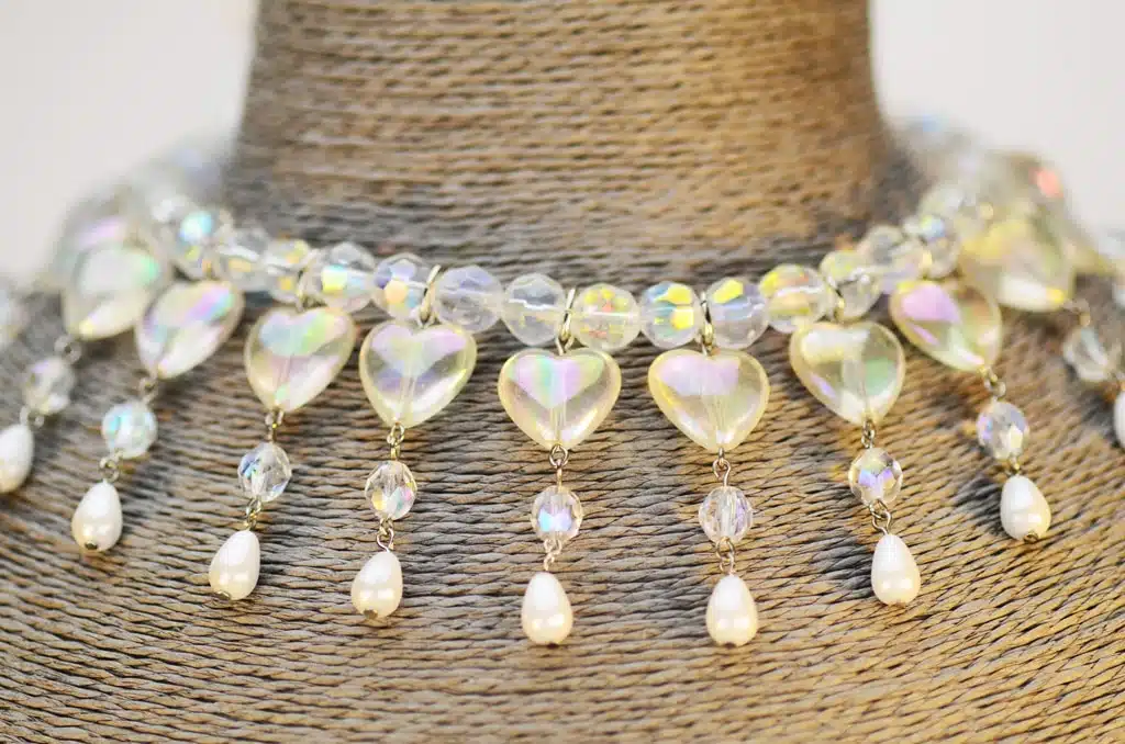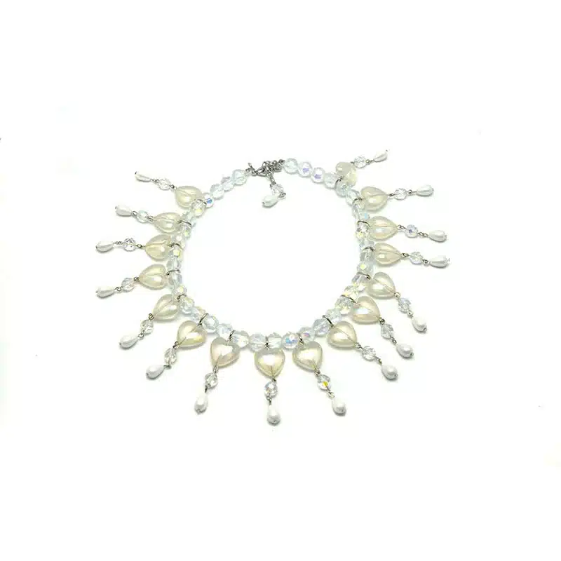 Choker set met hartjes en faux parels is een apart setje. Tussen de doorzichtige kralen zijn er rondom mooie doorzicht hartjes gezet. Deze hangen elegant naar beneden. En kijk dat is nog niet alles! Aan het uiteinde van dat alles hangen ook nog eens faux parels in de vorm van een druppel.